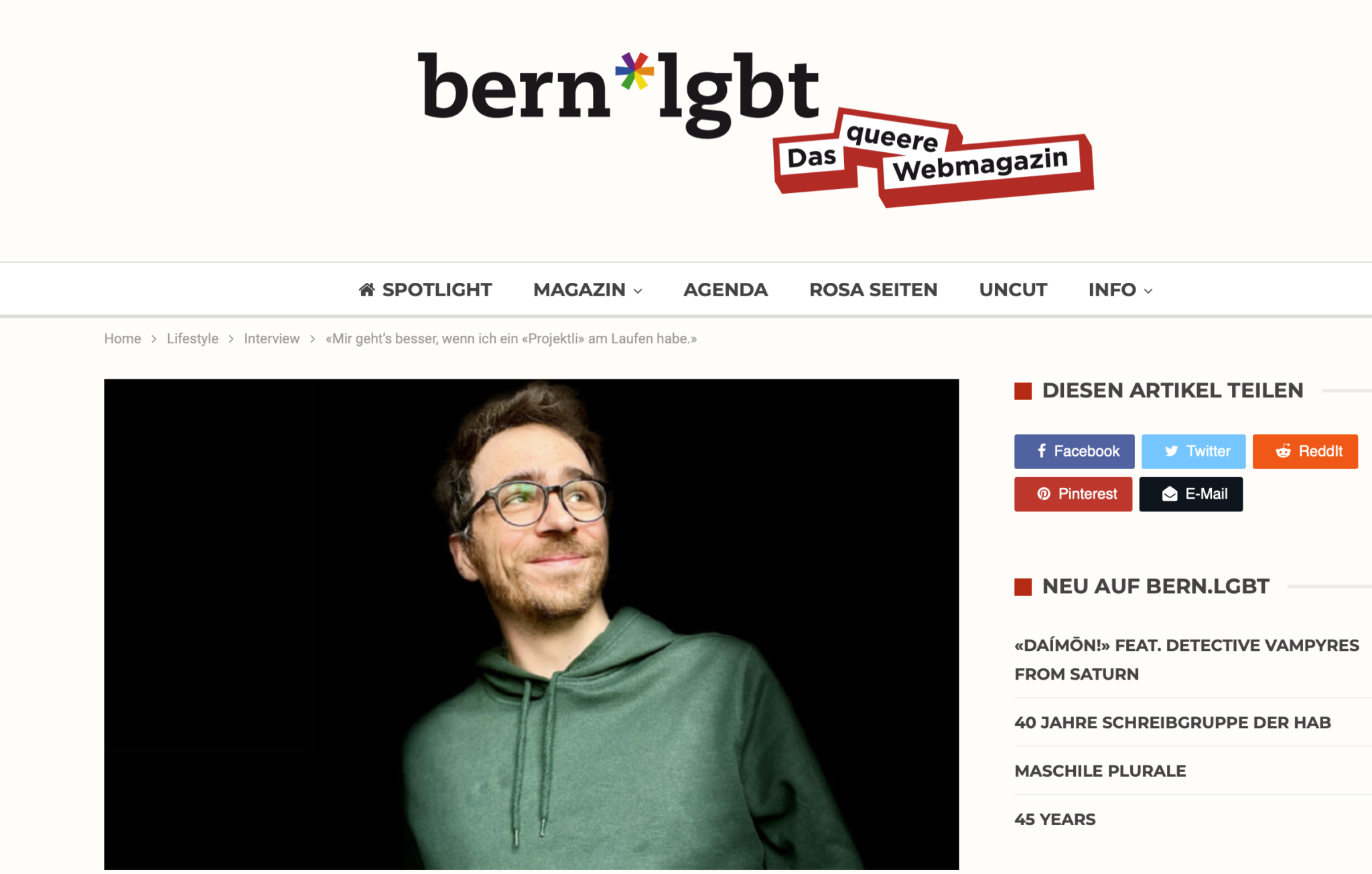 bern.lgbt: «Mir geht’s besser, wenn ich ein «Projektli» am laufen habe» Seit kurzem unterstützt Fabio Huwyler im Ressort Kommunikation Sasha Hug und zeichnet für den Newsletter und für die… In the Media 10. August 2023 byFabio Huwyler